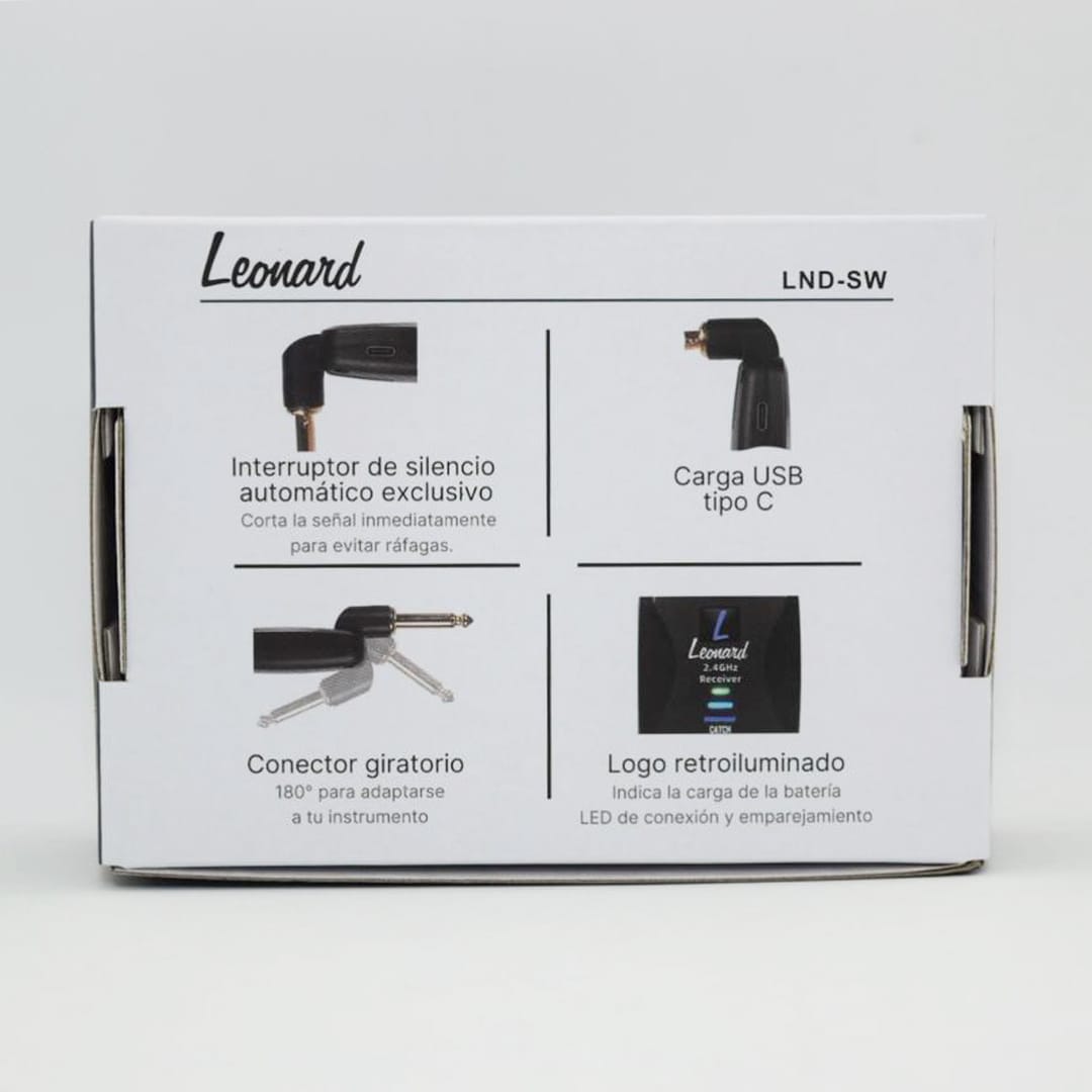 El Leonard LNDSW es un sistema inalámbrico digital diseñado para instrumentos como guitarra, bajo y teclados, destacándose por su facilidad de uso "plug and play" y su tecnología de 2.4GHz que garantiza una transmisión estable y sin cables.